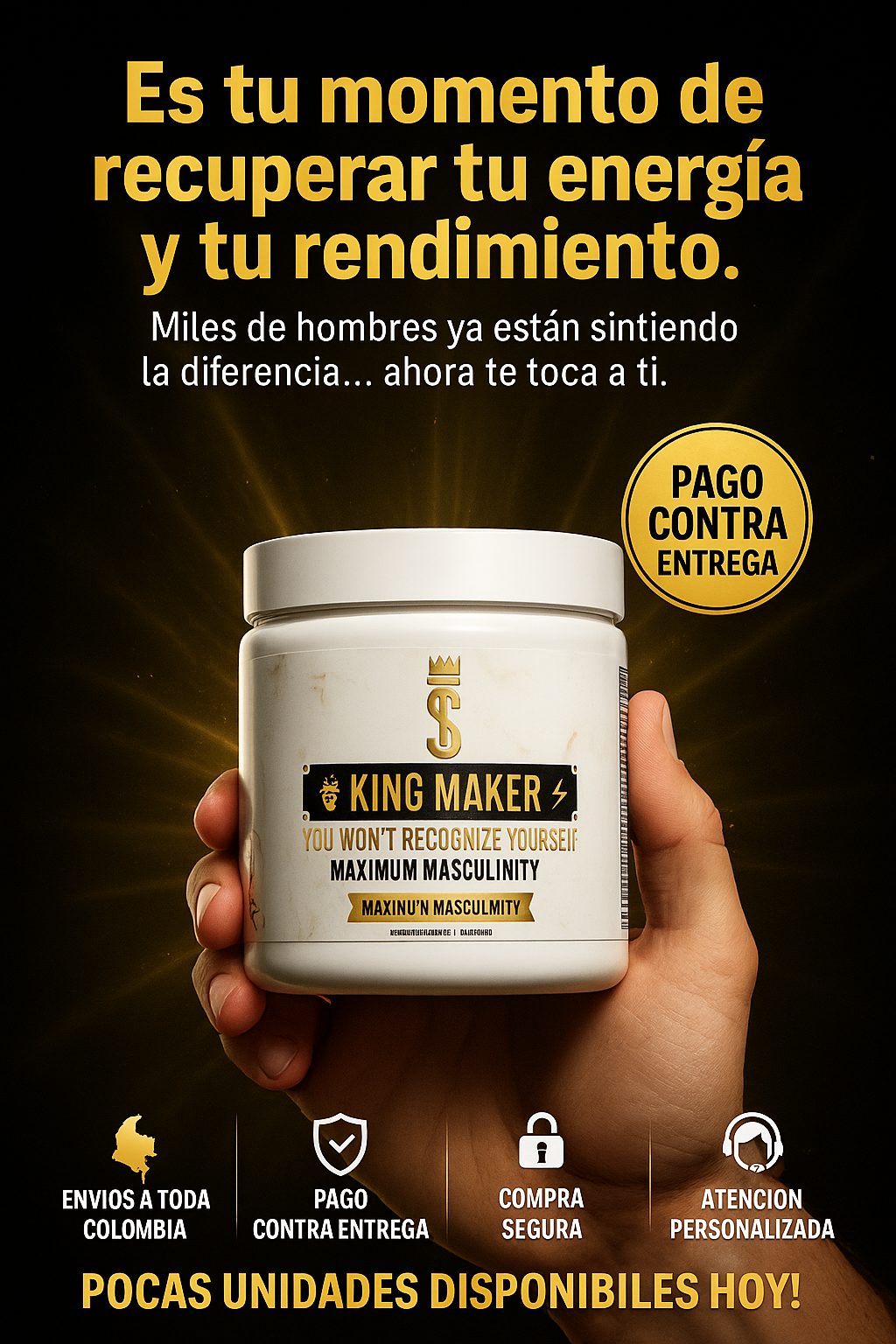 King Maker combina 13 ingredientes activos reales como Tongkat Ali, Fadogia Agrestis, turkesterona, ecdisterona, zinc, magnesio y vitamina D3, además de betarraga y Vinitrox. Esta fórmula trabaja para subir tu testosterona, mejorar tu fuerza, energía, libido, circulación y rendimiento físico–sexual.